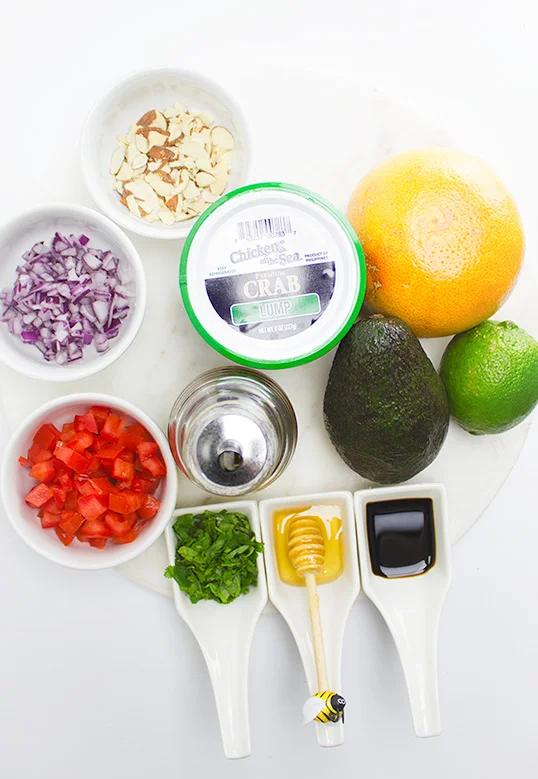 The major draw to this dish is having a medley of clean, fresh, vibrant flavors. If you’re investing in good crab meat, do the same with the fruits and herbs so they may shine. Whenever working with cut avocado, squeeze on fresh citrus juice (e.g. lime) in order to slow oxidation/browning. The dressing is quick and easy, and requires even less prep than cutting up all the elements. We are squeezing and juicing the leftover membrane of the grapefruit after cutting out segments because it reduces waste and gives us just the right amount of juice. For the basic vinaigrette, play around with the acid to oil balance, as well as additional flavorings, until you get an emulsified texture and bold flavor. As for layering, the building order is completely up to you and what you find visually pleasing. The only things I would recommend are starting with a stable, sturdy base (like tomato or avocado) and topping off with crunchy almonds for maximum texture and minimal sogginess.